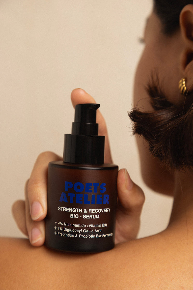 Strength & Recovery Bio-Serum is an ultra-lightweight fluid, formulated to soothe and repair stressed skin. This serum features biotech actives, prebiotics & probiotic bio-ferments that have been selected to calm inflammation while also working to simultaneously fade hyperpigmentation, redness and discolouration by targeting multiple cellular pathways.
